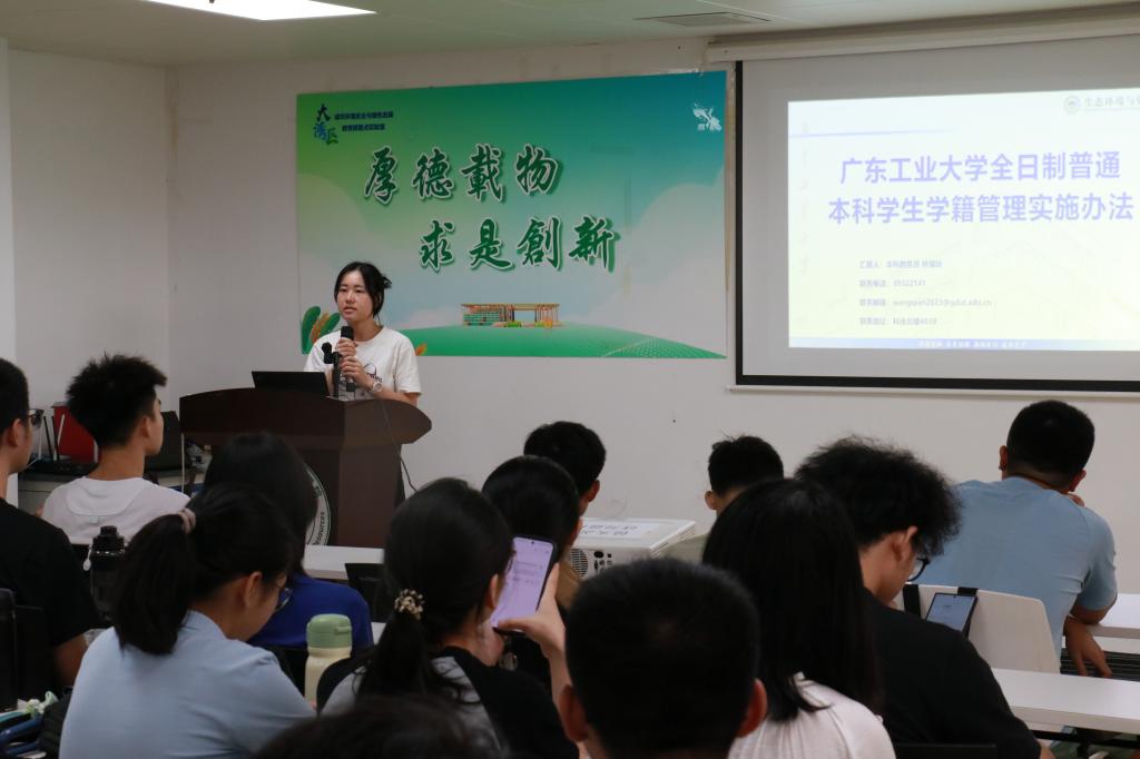 本科生教务秘书林憶玲老师在科技北楼401为新生详细介绍了学校的学籍管理规定。她解析了从入学到毕业的全过程学籍要求,协助新生准确把握学分、考勤、考核、体测等准则,为同学们合理规划学业路径奠定基础。