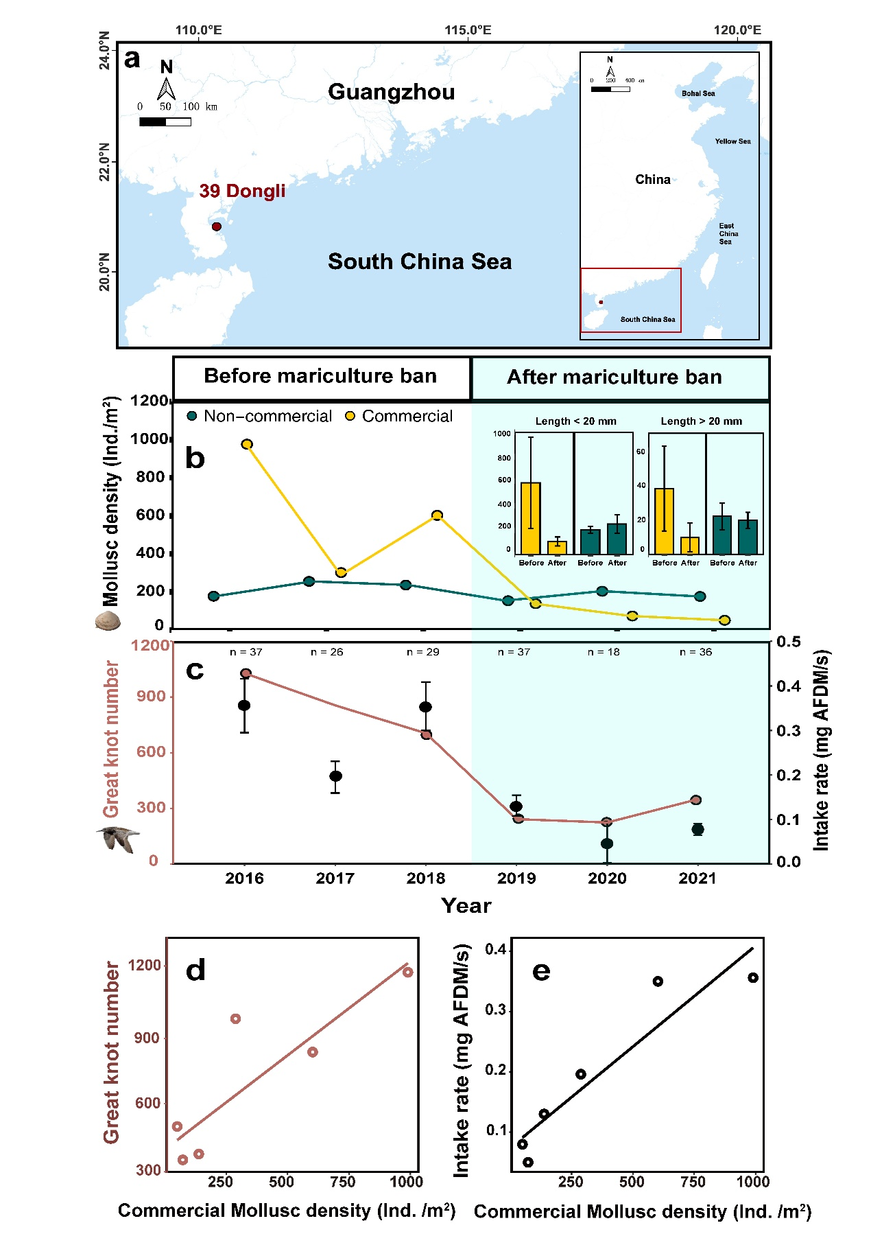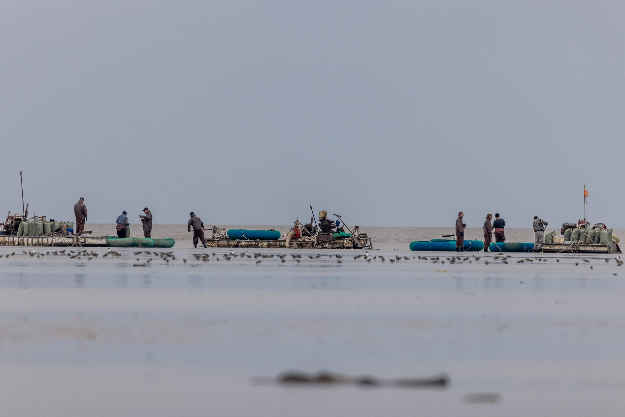 作为全球贝类养殖产量最多的国家,中国的贝类养殖占全球总量的70%以上,尤其是沿海地区的贝类养殖广泛存在,深刻影响着滨海生物多样性的组成和结构。本研究团队在中国沿海40多个重要湿地开展了为期十年(2011-2021)的监测研究,重点关注潮间带贝类养殖如何改变贝类的分布和群落结构。此外,团队将这些栖息地食物数据与中国沿海水鸟同步调查数据相结合,分析潮间带贝类养殖引起的贝类组成和分布变化如何影响顶级捕食者——鸻鹬类水鸟的分布和种群动态。最后,团队在一个重点研究地点跟踪了养殖禁令实施后的变化,研究了禁止滩涂贝类养殖所带来的影响:贝类群落的变化以及这些变化如何影响水鸟的能量补给和种群动态。通过这些数据集,团队提供了一个全沿海、长期的视角,展示了中国沿海潮间带贝类养殖在水鸟迁徙停歇窗口期和能量补给区域对迁徙鸟类的影响。
