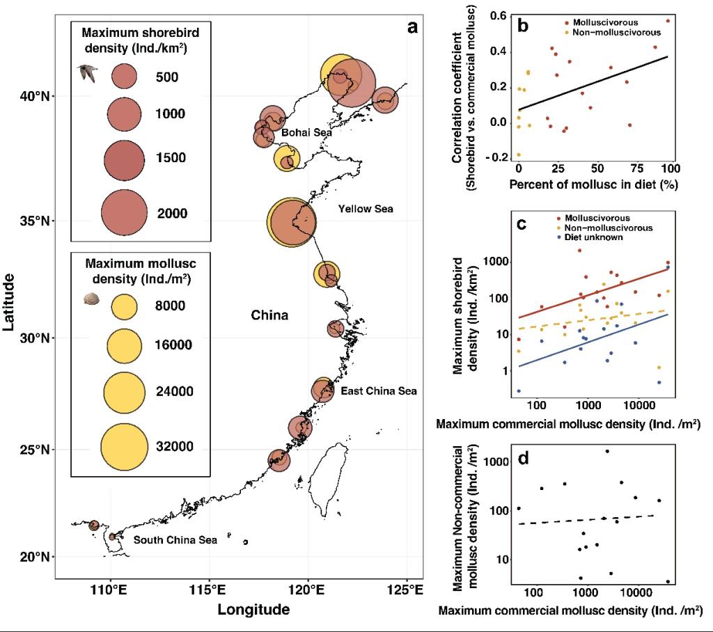 研究结果表明,中国沿海的养殖贝类成为迁徙鸻鹬类水鸟的重要食物来源,特别是对于依赖贝类的物种。在调查的25个停歇地,约75%的水鸟种群为贝类食性鸟类,它们在北迁时大量依赖这些养殖贝类进行能量补给。调查还发现,养殖贝类的密度与水鸟的栖息密度空间分布显著相关,尤其是在高密度的养殖区域,水鸟的数量显著增加。