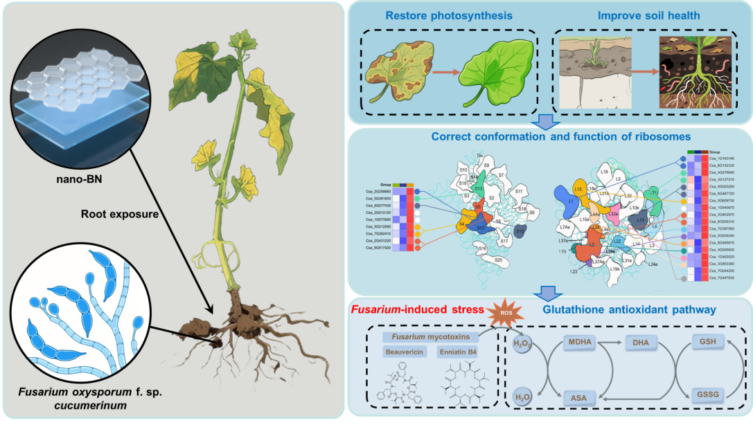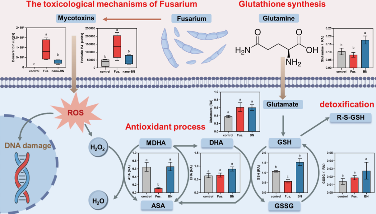 研究结果表明,根部施用50 mg/kg的nano-BN可使受镰刀菌侵染作物的地上部生物量提高64.9%,使光合参数恢复至接近健康水平。nano-BN通过破坏镰刀菌菌丝和孢子的超微结构,直接抑制病原菌生长,并使镰刀菌毒素(如白僵菌素和镰孢菌素)产量降低63%以上,从源头上减轻了对植物的毒害。代谢组学结果表明,nano-BN通过增强谷胱甘肽代谢途径,使谷胱甘肽和抗坏血酸含量显著增加166.67%和478.78%,有效缓解了病原菌引发的氧化损伤。