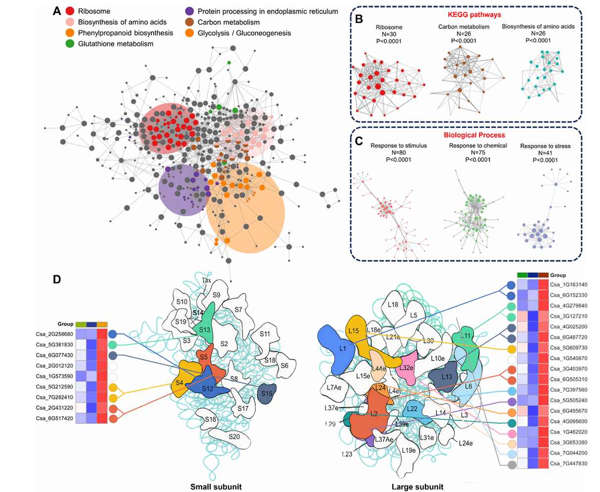 图4蛋白质组学揭示nano-BN缓解镰刀菌胁迫机制。(A)差异表达蛋白的蛋白质互作(PPI)网络。圆圈代表蛋白质,不同颜色代表PPI网络中主要KEGG通路中的蛋白质;(B)PPI网络中主要KEGG通路模块;(C)PPI网络中与植物胁迫相关的主要生物过程;(D)PPI网络中的核心簇。热图代表不同处理下的蛋白质含量,而不同颜色的线条表示各种核糖体蛋白在已知核糖体结构中的分布和定位。