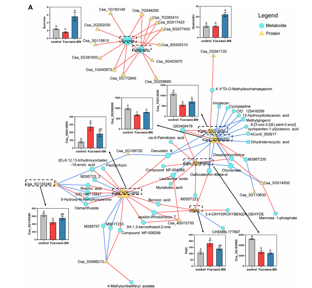 蛋白质组学与蛋白互作网络分析进一步揭示nano-BN逆转了由镰刀菌侵染导致的核糖体蛋白和内质网应激相关蛋白的表达抑制,有利于促进蛋白质合成与核糖体结构稳定。多组学联合分析识别出蔗糖和geshoidin两种关键代谢物作为代谢物-蛋白质网络的核心节点。nano-BN显著提高了蔗糖和geshoidin的含量,并通过它们正向调控了与抗病密切相关的核糖体蛋白及线粒体蛋白,增强了植物的系统抗性。