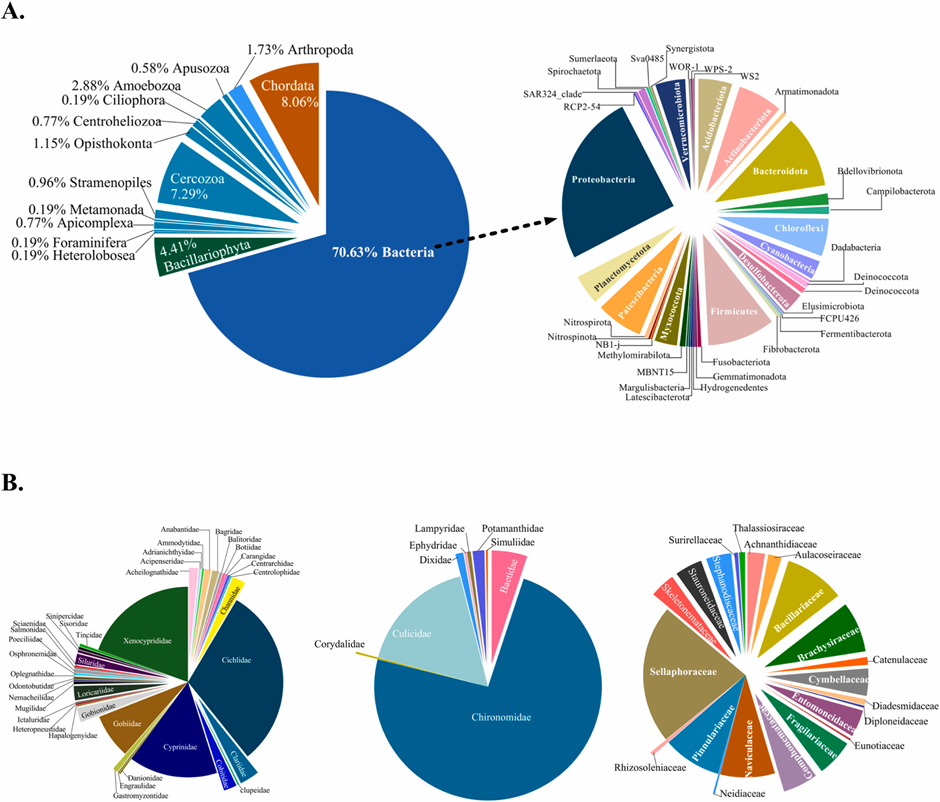 5. eDNA生命树中具有明确门水平分类鉴定的OTUs比例(A),以及鱼类、水生昆虫和硅藻在科水平上的OTUs比例(B)。